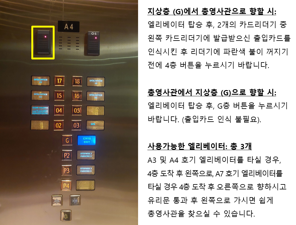 안내데스크 좌측(2m)에 위치한 출입차단기에 출입카드를 인식시킨 후 엘리베이터(A3, A4, A7호기)에 탑승하시면 됩니다.