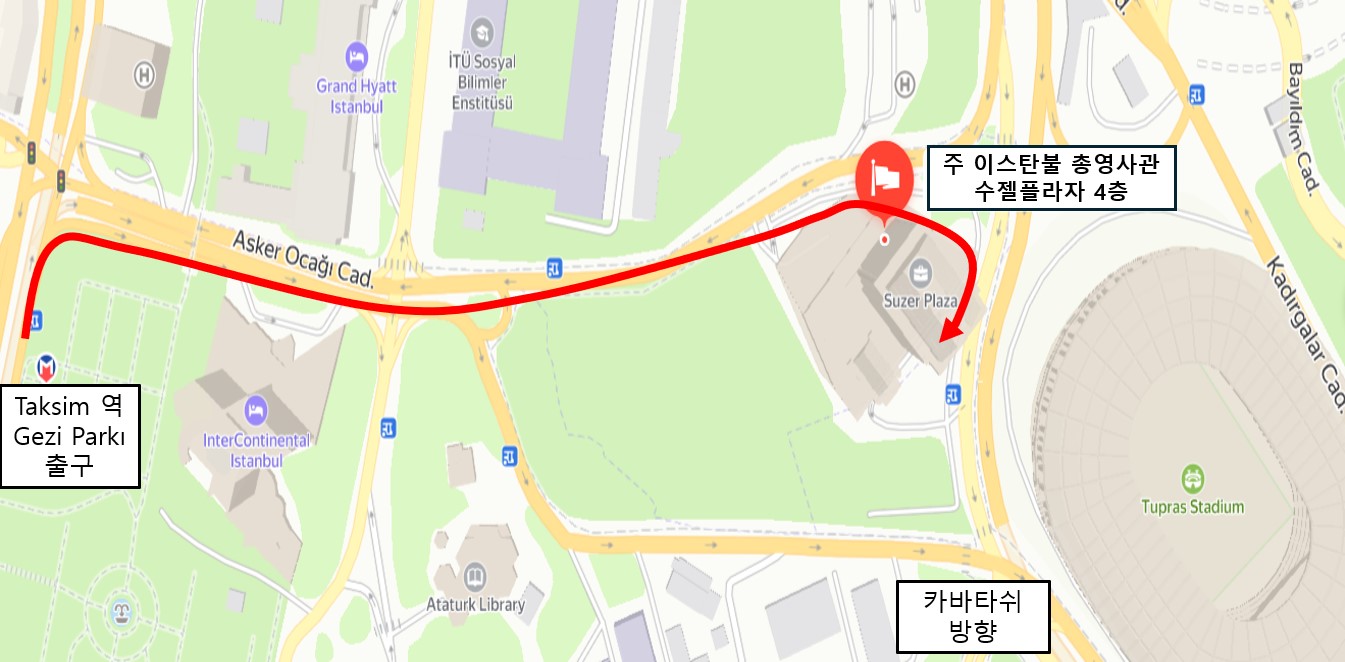 ② Taksim역 Gezi Park 출구로 나오셔서 직진, Divan 호텔을 마주보고 우회전한 후, 대로(Askerocağı Caddesi)를 따라 우측으로 걸으시다보면 우측에는 InterContinental 호텔, 좌측에는 Grand Hyatt 호텔이 보이실 겁니다. InterContinental 호텔을 지나 언덕 아래쪽으로 계속 걸으시다보면 정면에 Ritz-Carlton 호텔이 보이실 겁니다. Ritz-Carlton 호텔이 보일때, 호텔의 왼쪽 방향으로 언덕을 50m 정도 내려가다보면 Süzer Plaza 입구를 발견하실 수 있습니다.